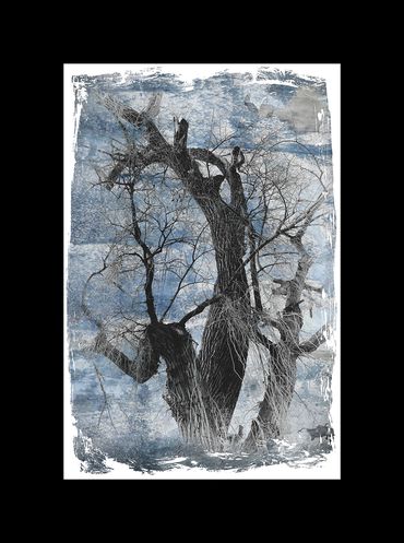 This New Series comes from a group of double exposure studies of Siberian Elms in Santa Fe during the winter. I've always been fascinated by the stark and sinuous shapes of the barren trees in Winter, so black and bold against the morning sky. In post-process I added various textures and borders to give them more of an Asian Scroll Painting Look. I was inspired by the unique qualities of Yoshitoshi's Wood Bock Prints.